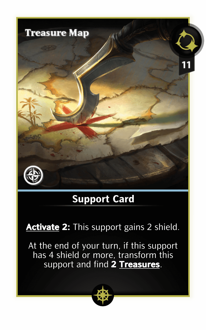 Activate 2: Gain 1 shield.At the end of your turn, if Treasure Map has 4 or more shield, transform this support and find 2 Treasures.