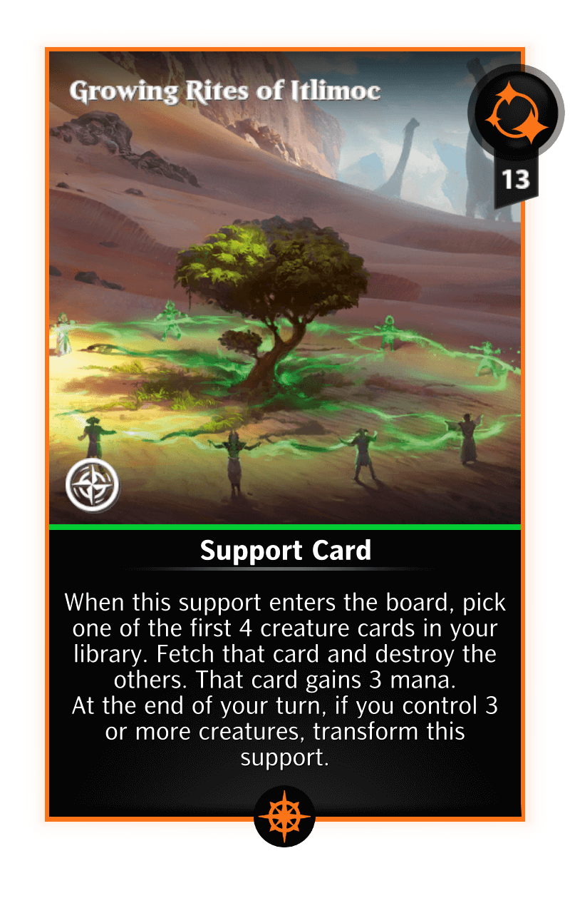When this support enters the board, pick one of the first 4 creature cards of your library. Fetch that card and destroy the others. That card gains 3 mana. At the end of your turn, if you control three or more creatures, transform this support.