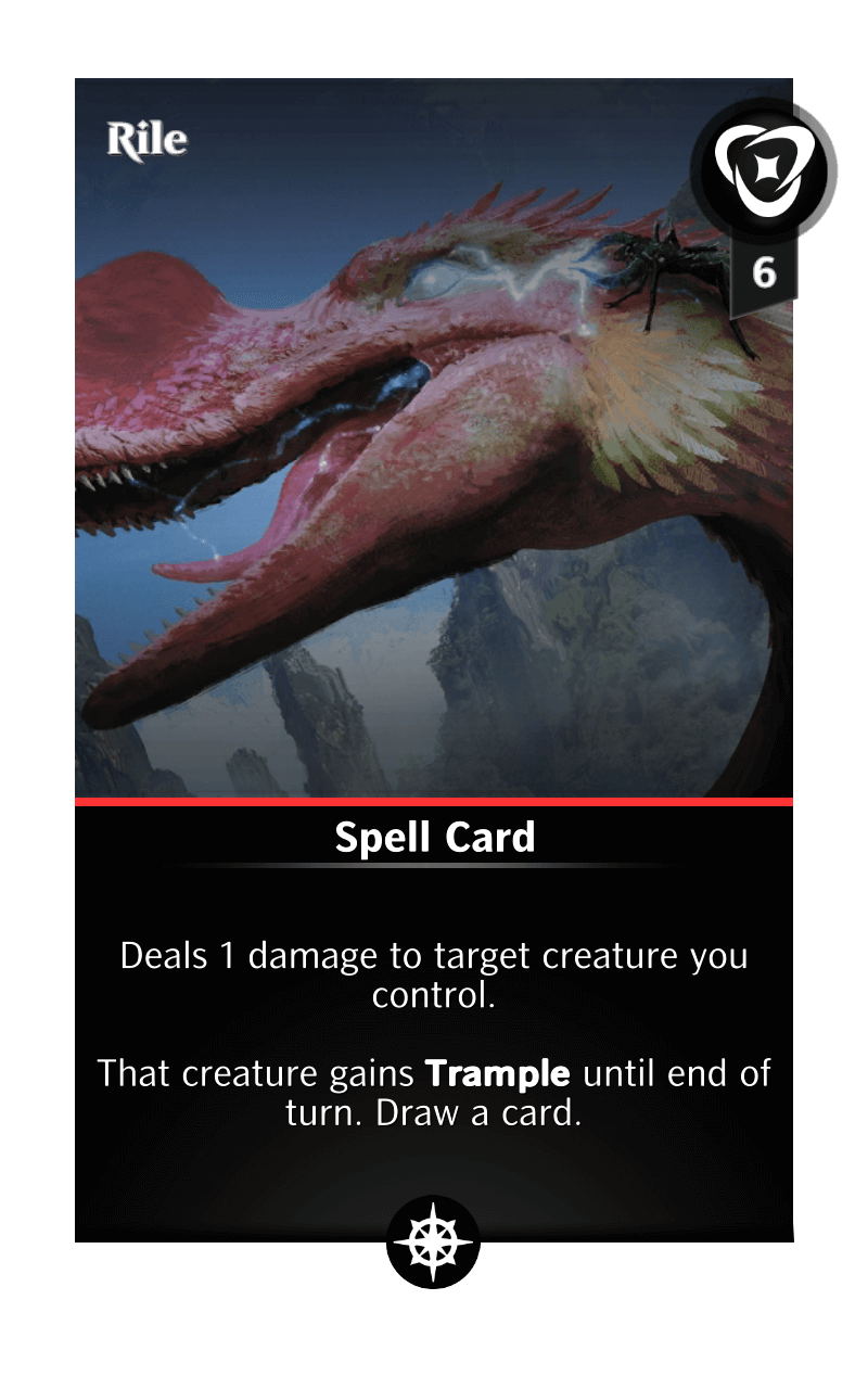Deals 1 damage to target creature you control. That creature gains Trample until end of turn. Draw a card.
