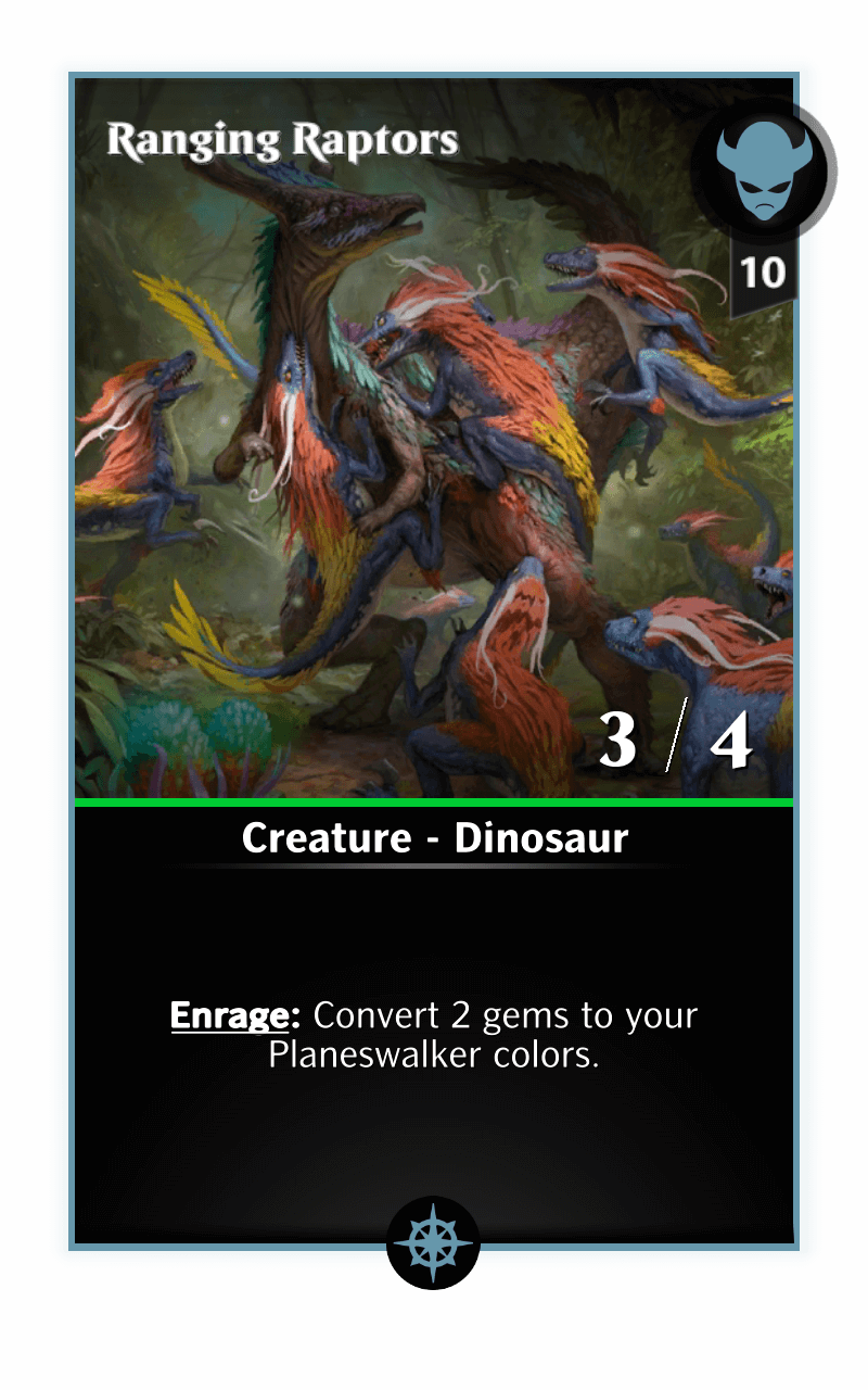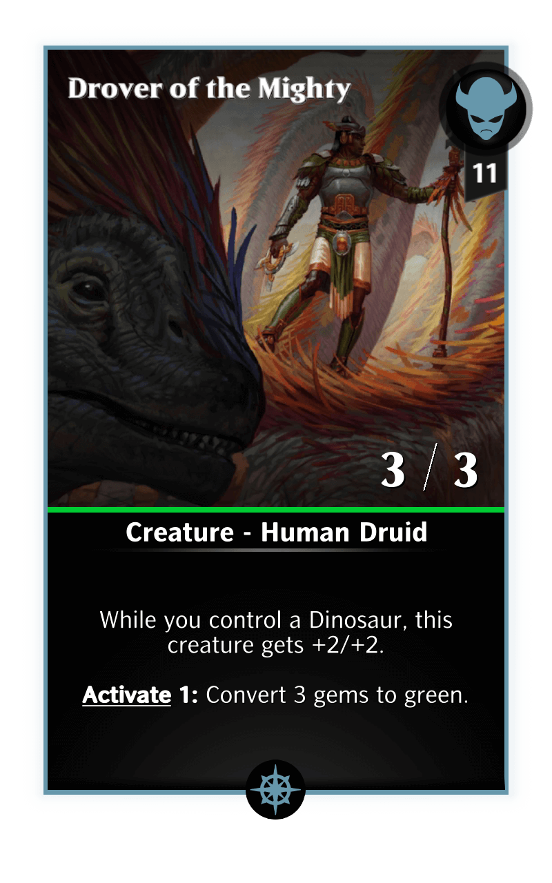 While you control a Dinosaur, this creature gets +2/+2.Activate 1: Convert 3 gems to green.