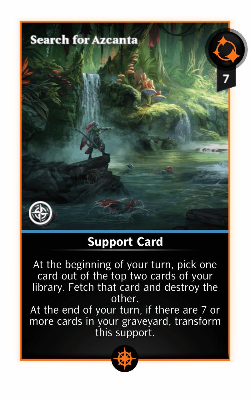 At the beginning of your turn, pick one from the top two cards of your library. Fetch that card and destroy the other.At the end of your turn, if there are 7 or more cards in your graveyard, transform this support.