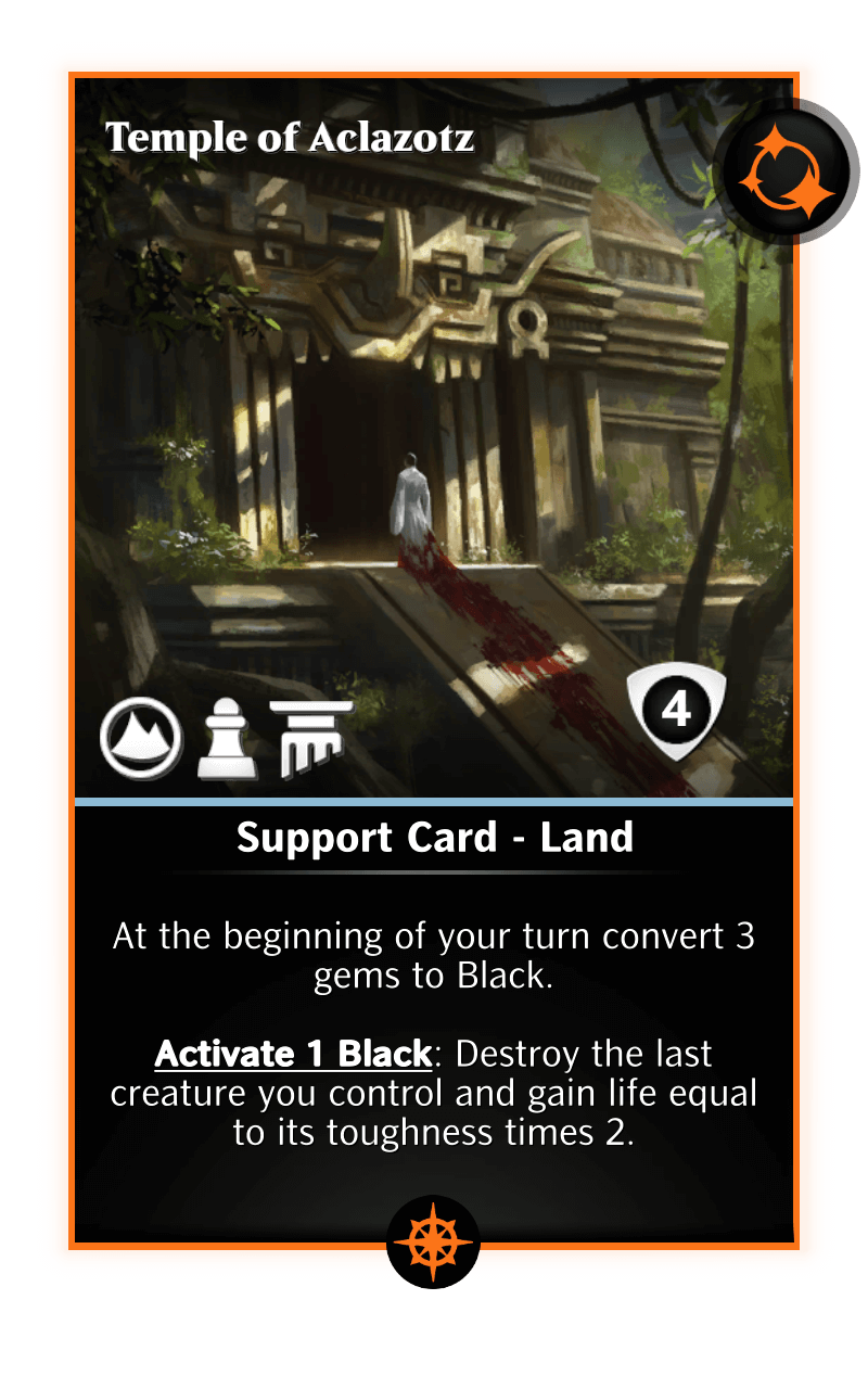 At the beginning of your turn convert 2 gems to black.Activate 1 Black: Destroy the last creature you control. Gain life equal to its toughness times 2.