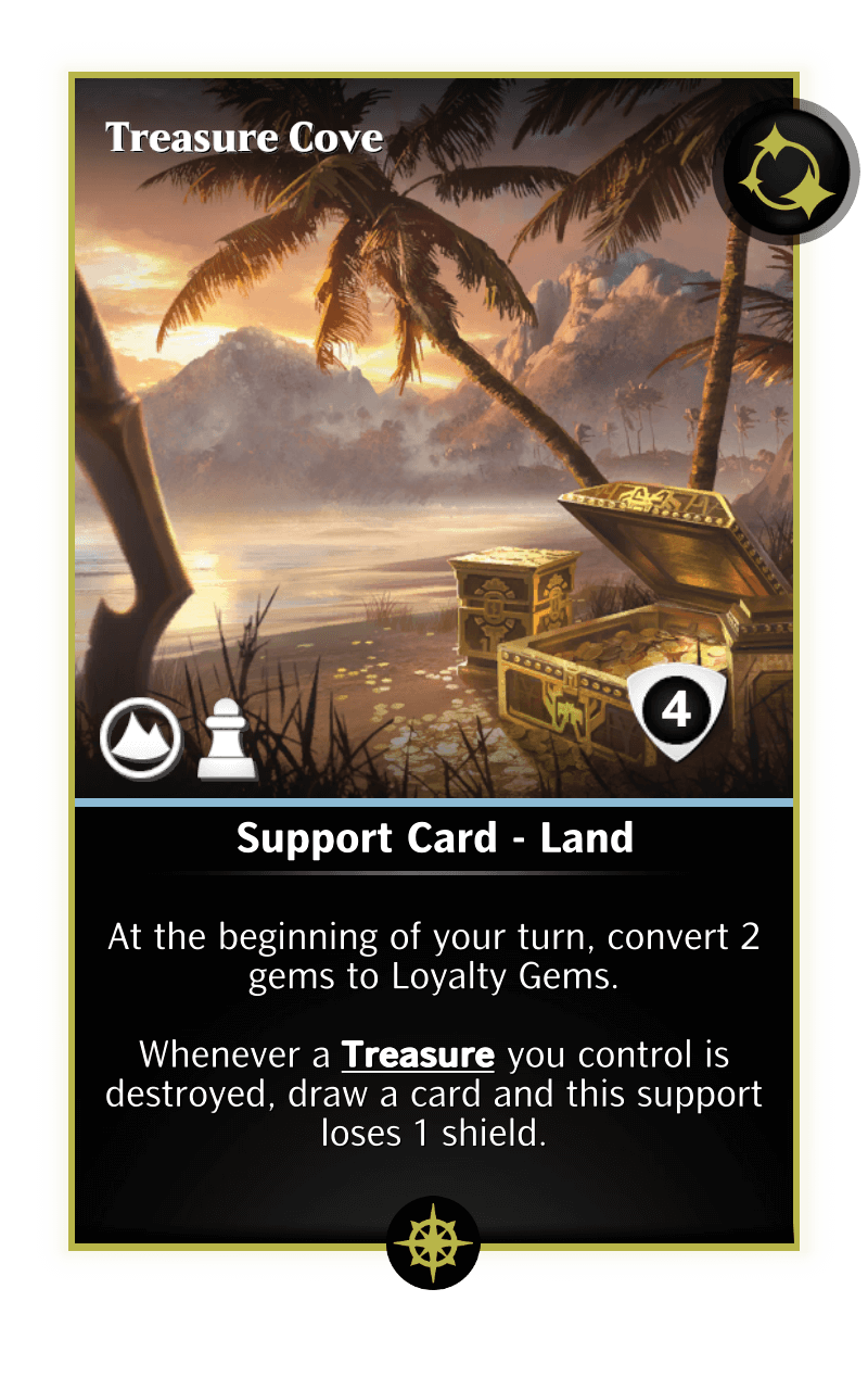 At the beginning of your turn, convert 2 gems to Loyalty Gems. Whenever a Treasure you control is destroyed, draw a card and this support loses 1 shield.