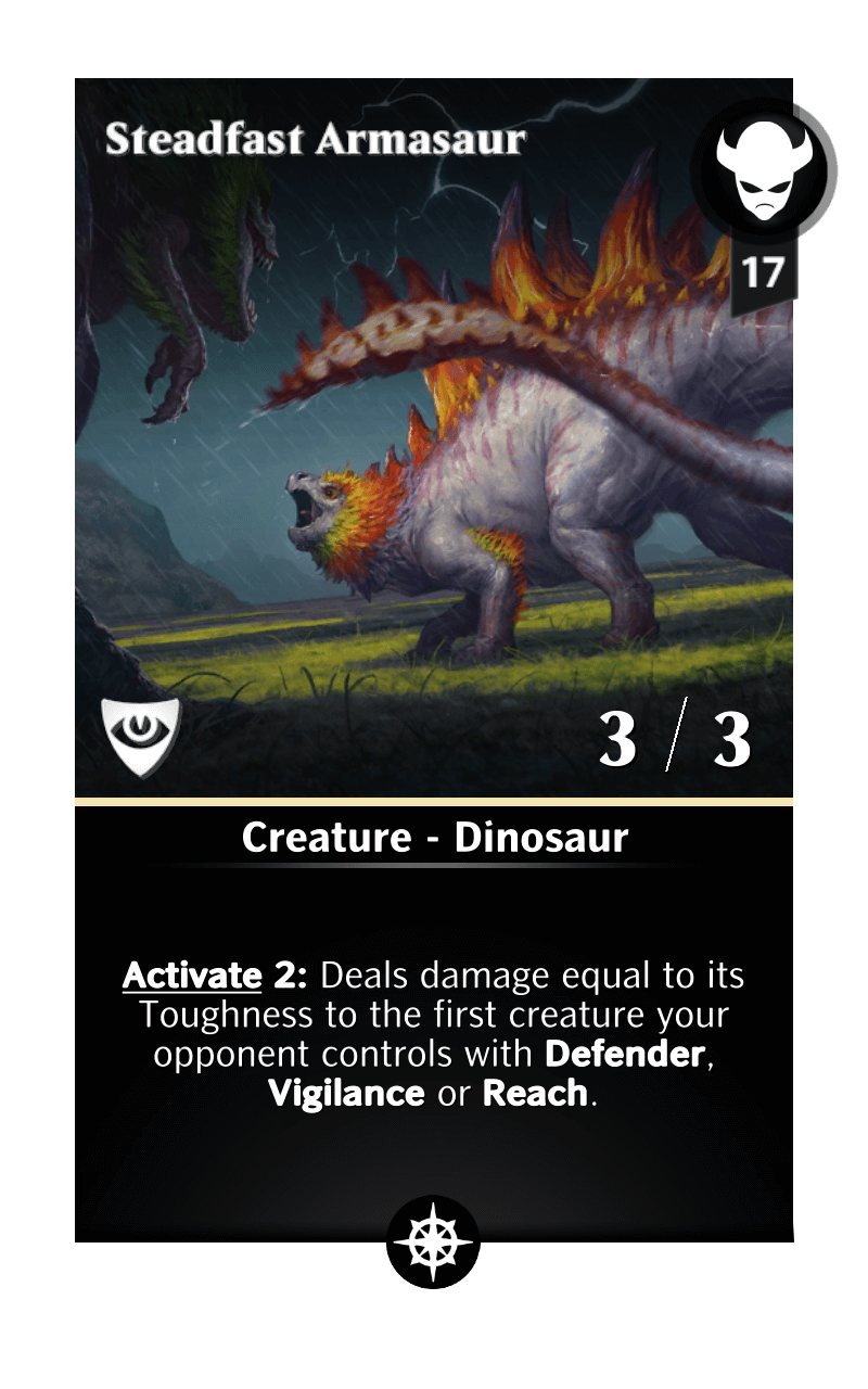 VigilanceActivate 2: Deals damage equal to its Toughness to the first creature your opponent controls with Defender, Vigilance or Reach.