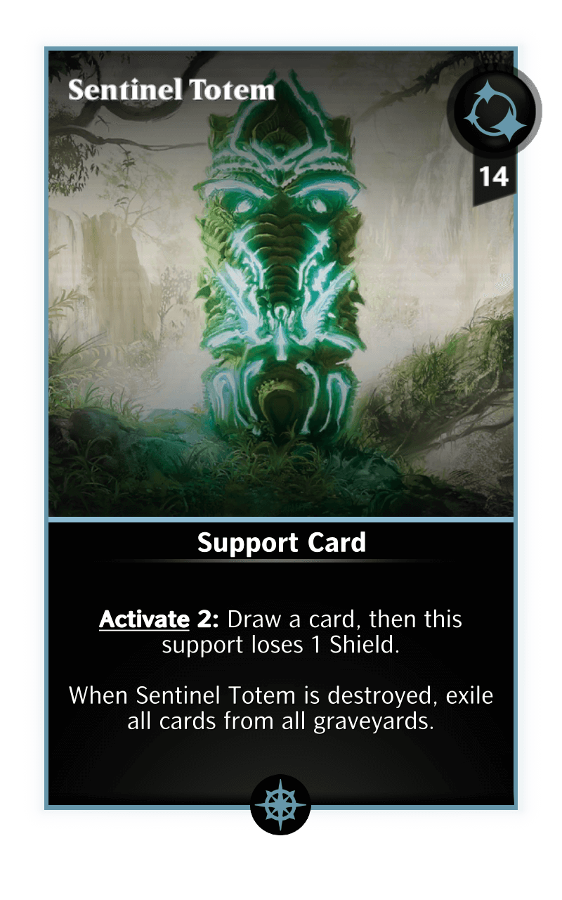 Activate 2: Draw a card, then this support loses 1 Shield.When Sentinel Totem is destroyed, exile all cards from all graveyards.