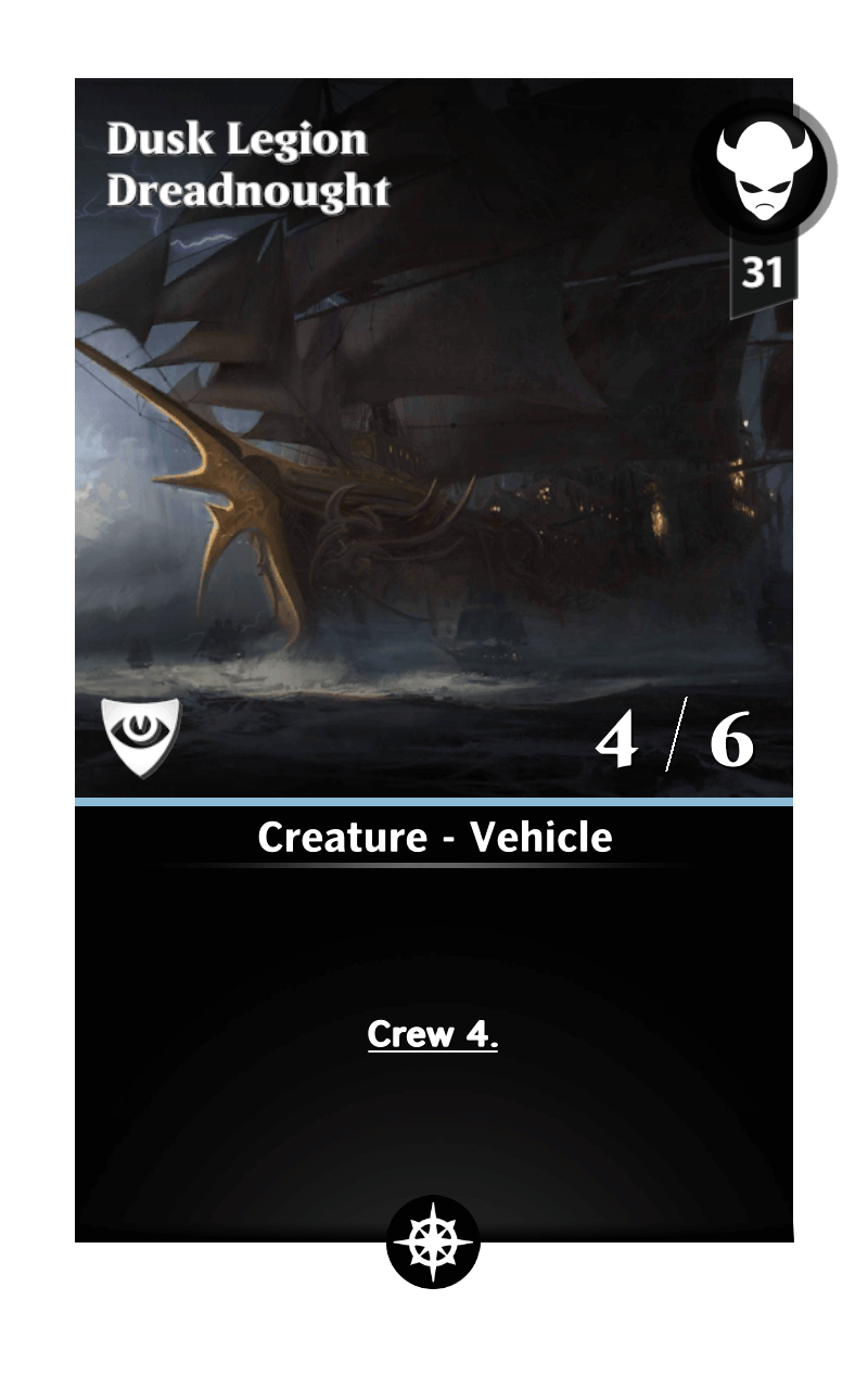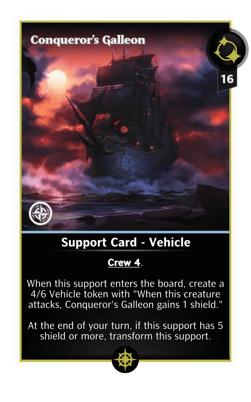 Crew 4. When this support enters the board, create a 4/6 Vehicle token with “When this creature attacks, Conqueror’s Galleon gains 1 shield.”