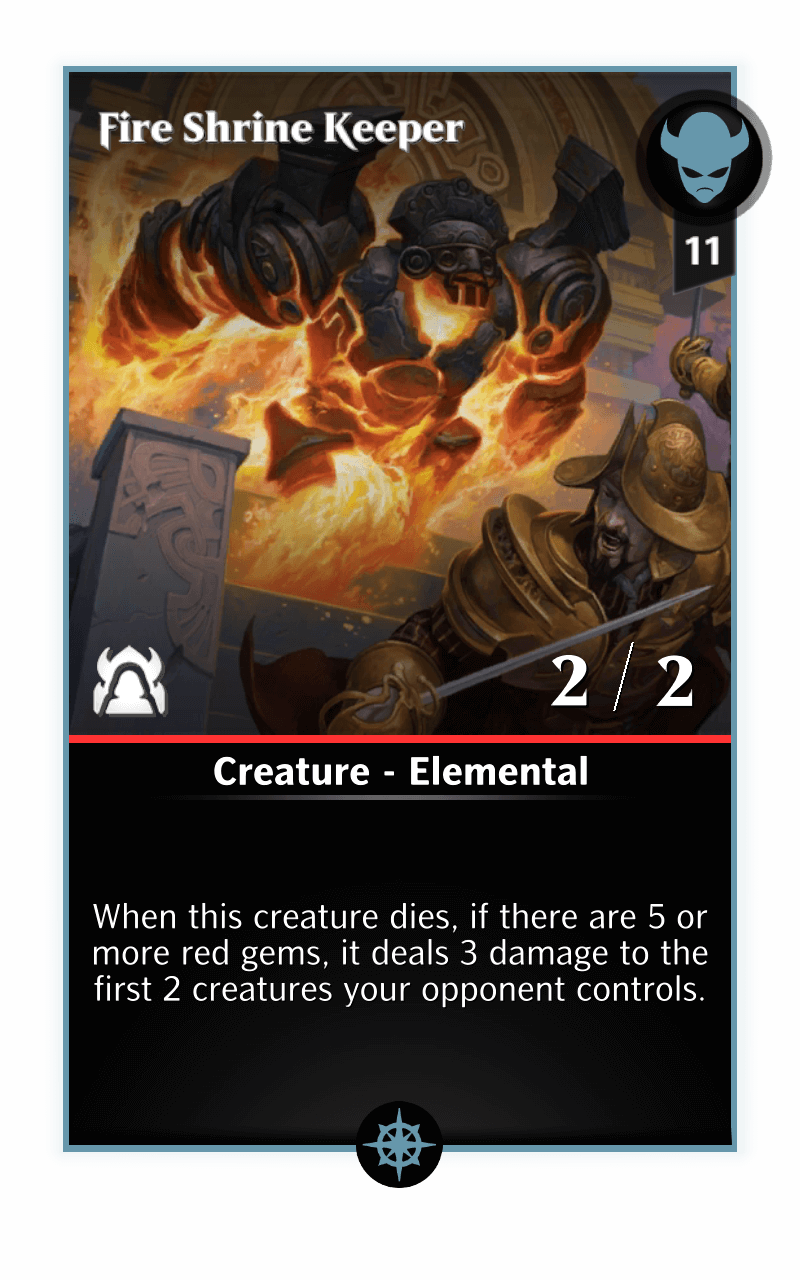 Menace.When this creature dies, if there are 5 or more red gems, it deals 3 damage to the first 2 creatures your opponent controls.