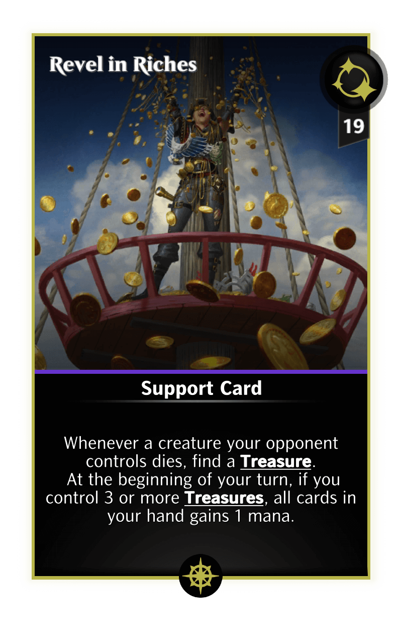 Whenever a creature your opponent controls dies, find a Treasure. At the beginning of your turn, if you control 3 or more treasures, all cards in your hand gains 1 mana.