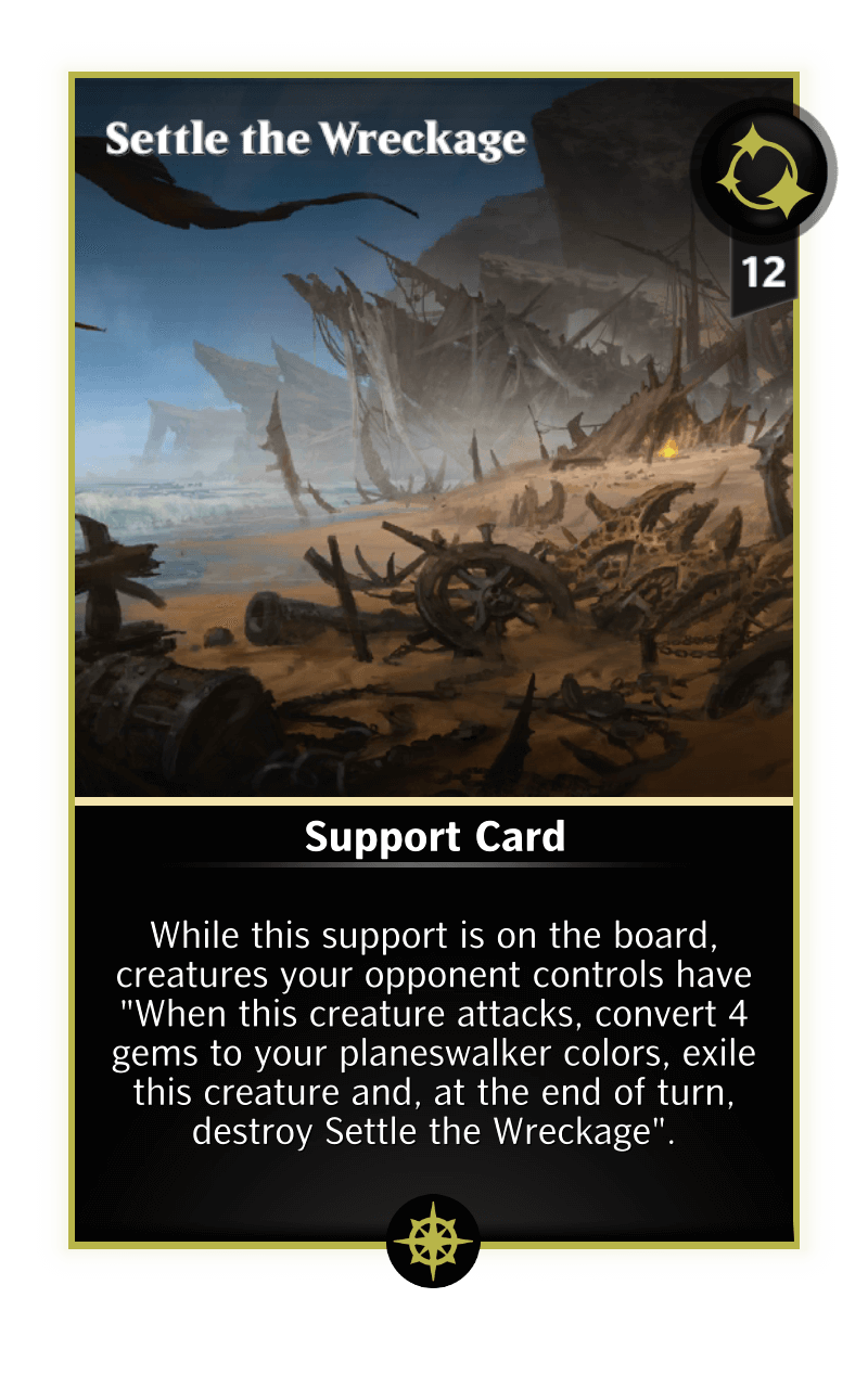 While this support is on the board, creatures your opponent controls have “When this creature attacks, convert 4 gems to your planeswalker colors, exile this creature and, at the end of turn, destroy Settle the Wreckage”.