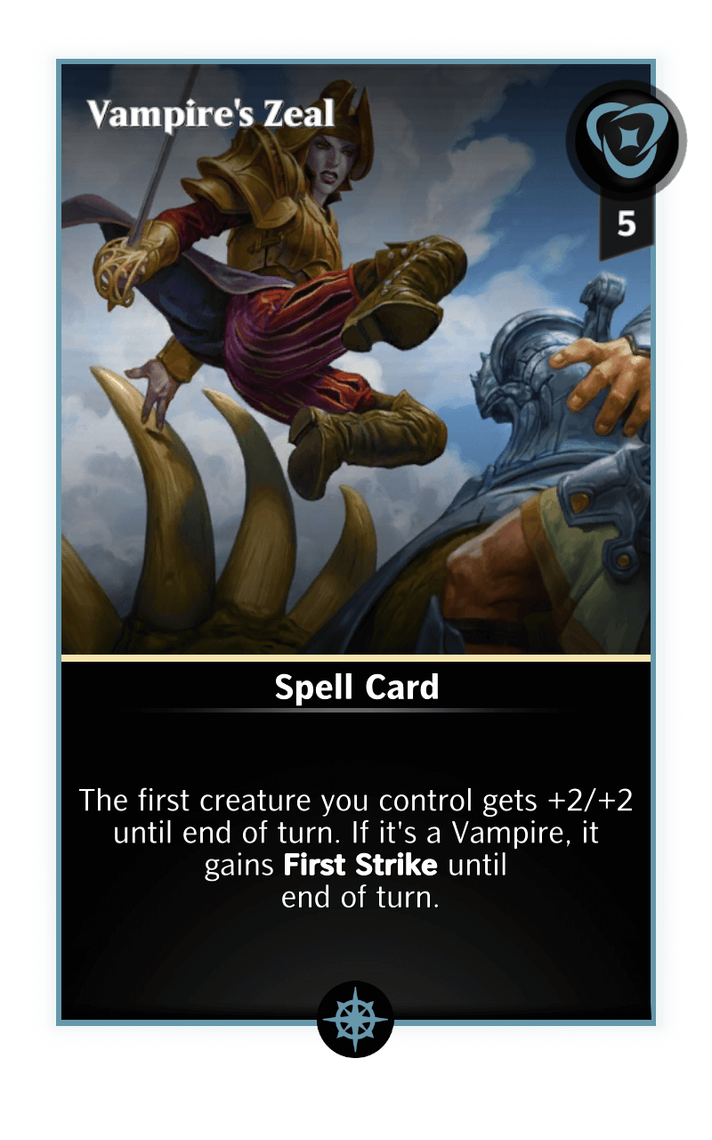 The first creature you control gets +2/+2 until end of turn. If it’s a Vampire, it gains First Strike untilend of turn.