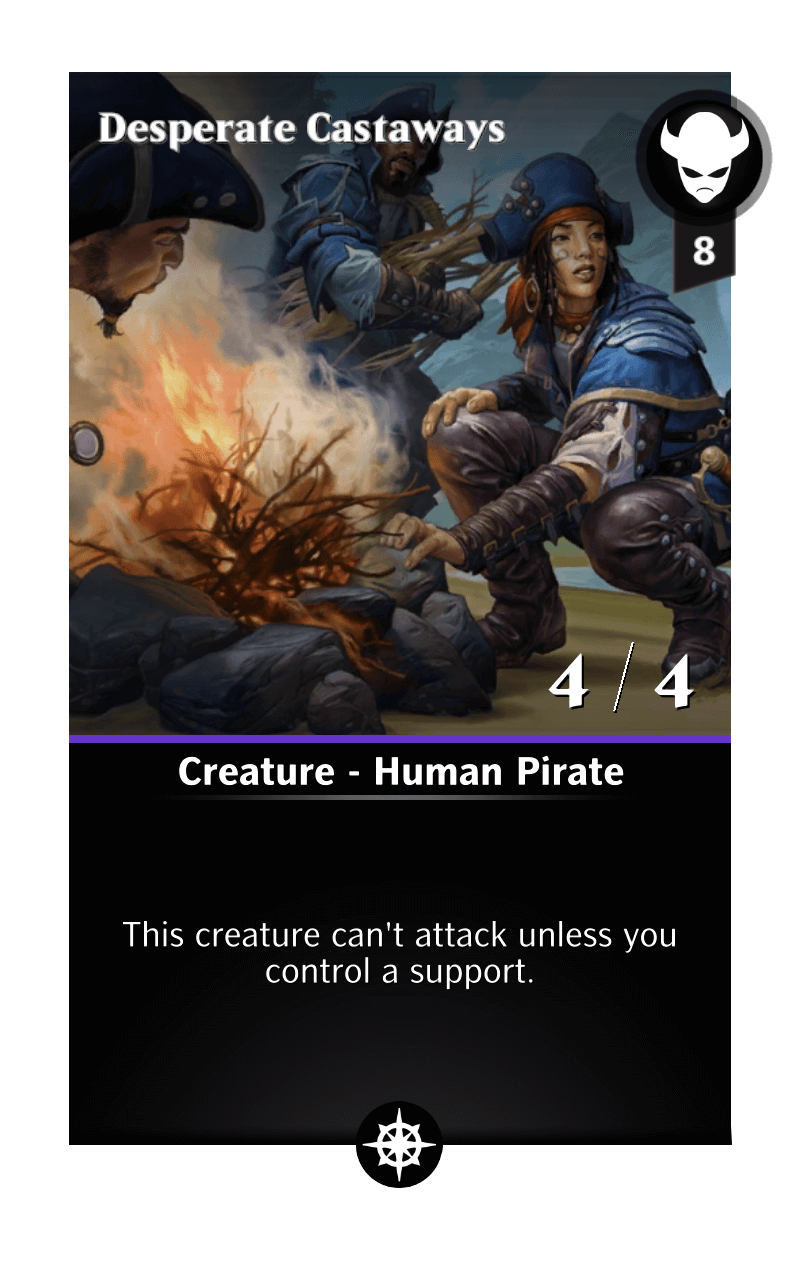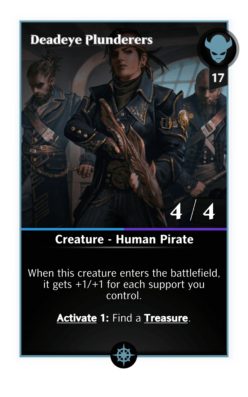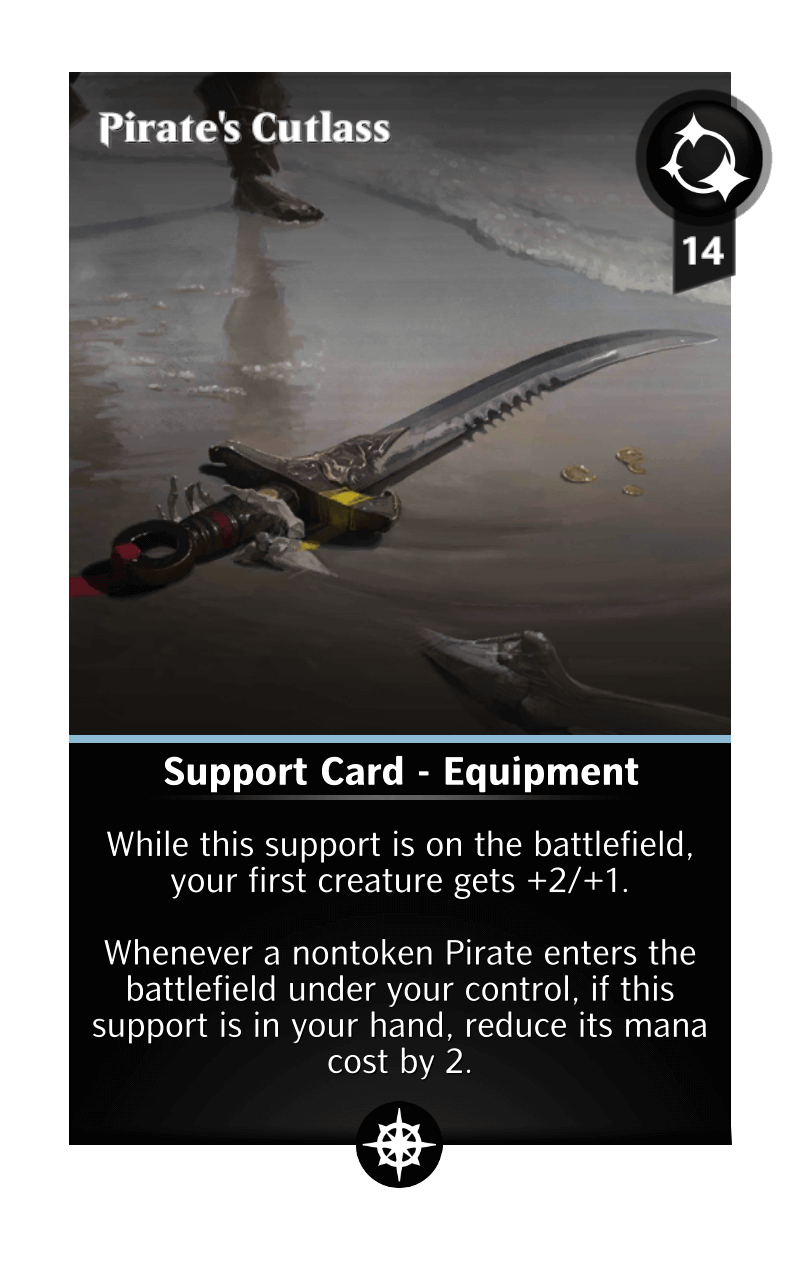 While this support is on the battlefield, your first creature gets +2/+1.Whenever a nontoken Pirate enters the battlefield under your control, if this support is in your hand, reduce its mana cost by 2.