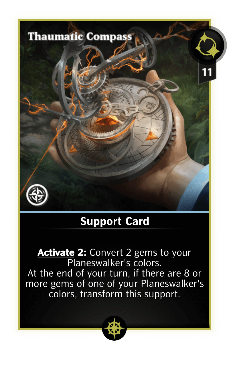 Activate 2: Convert 2 gems to your planeswalker colors.At the end of your turn, if there are 8 or more gems of one of your planeswalker colors, transform this support.