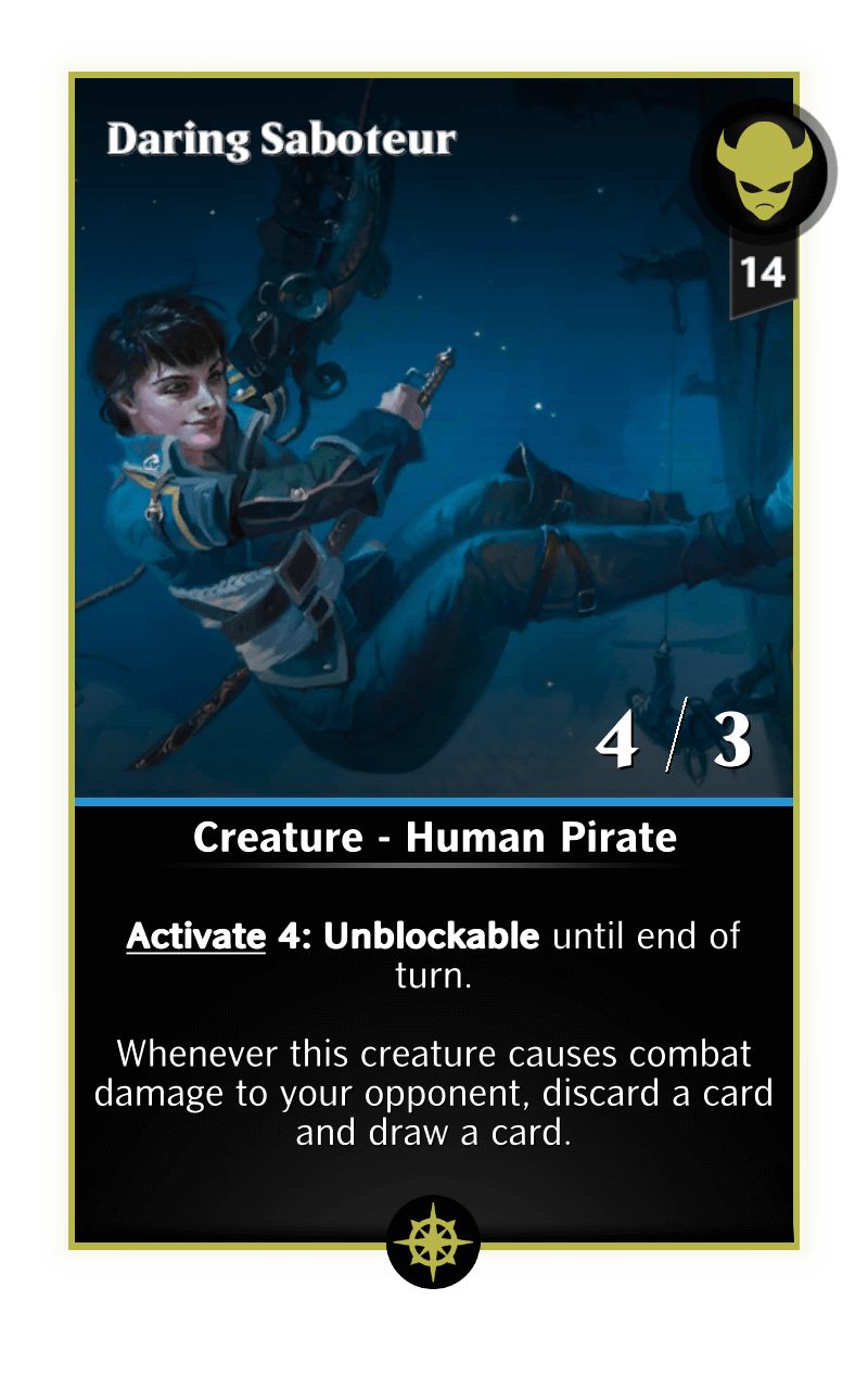Activate 4: Unblockable until end of turn.Whenever this creature causes combat damage to your opponent, discard a card and draw a card.