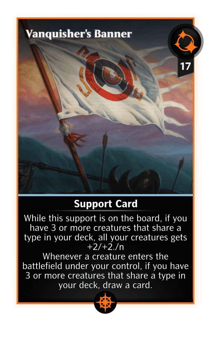 While this support is on the board, if you have 3 or more creatures that share a type in your deck, all your creatures gets +2/+2. Whenever a creature enters the battlefield under your control, if you have 3 or more creatures that share a type in your deck, draw a card.