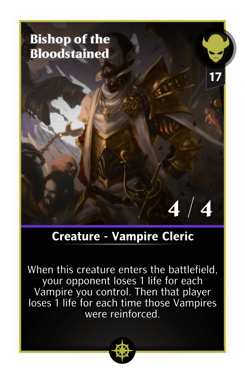 When this creature enters the battlefield, your opponent loses 1 life for each Vampire you control. Then that player loses 1 life for each time those Vampires were reinforced.