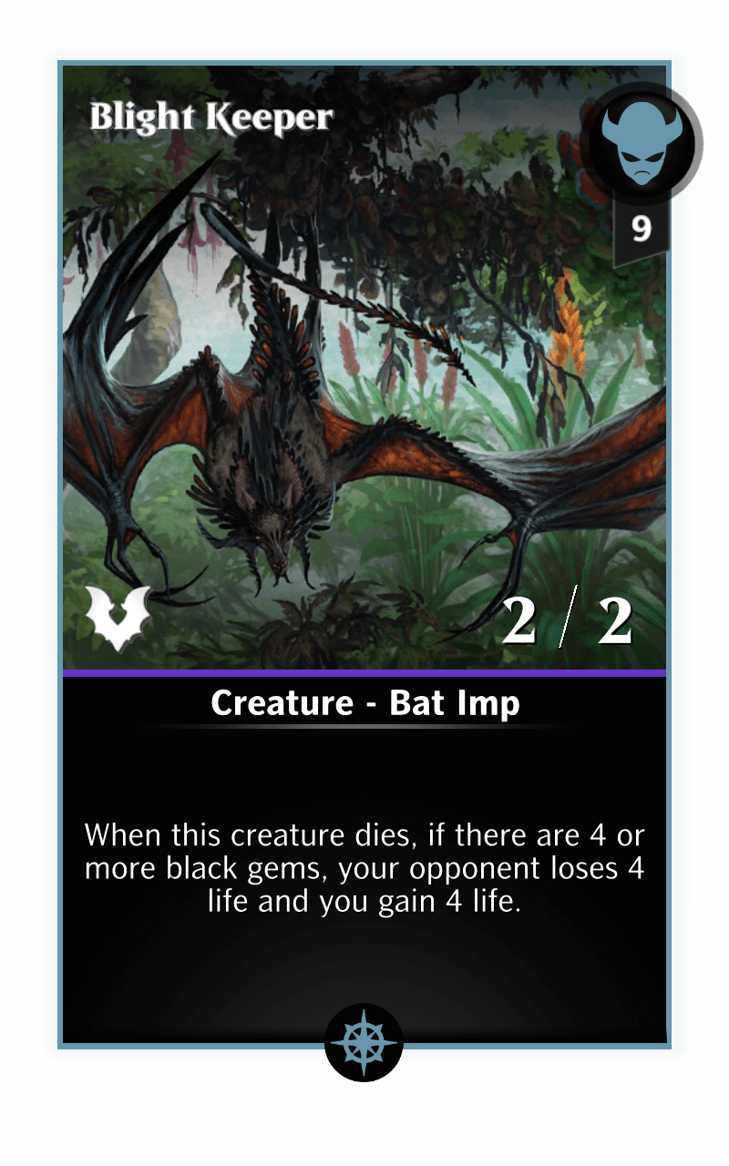 When this creature dies, if there are 4 or more black gems, your opponent loses 4 life and you gain 4 life.