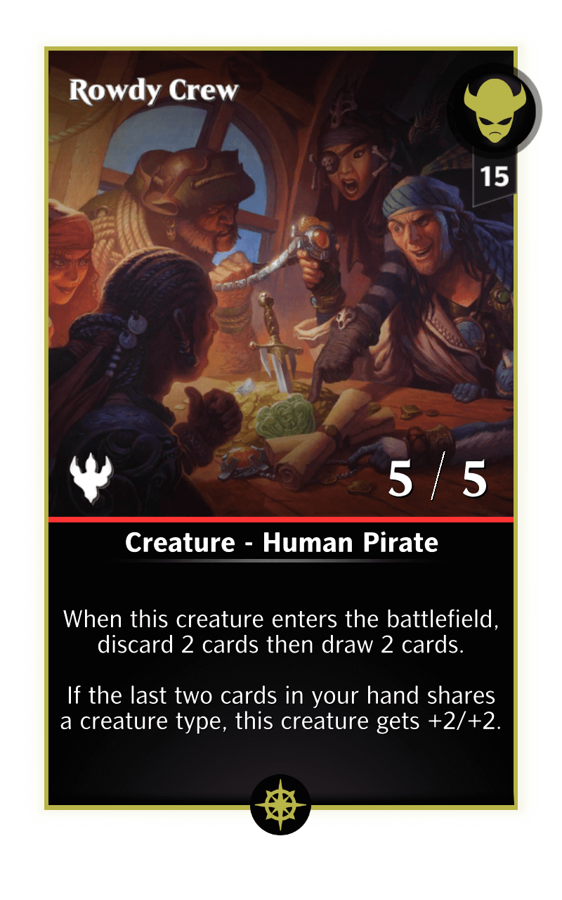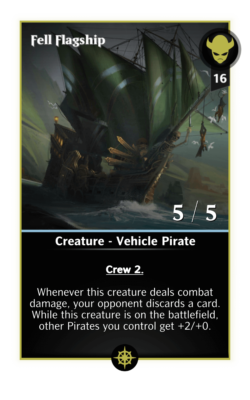 Crew 2.Whenever this creature deals combat damage, your opponent discards a card. While this creature is on the battlefield, other Pirates you control get +2/+0.