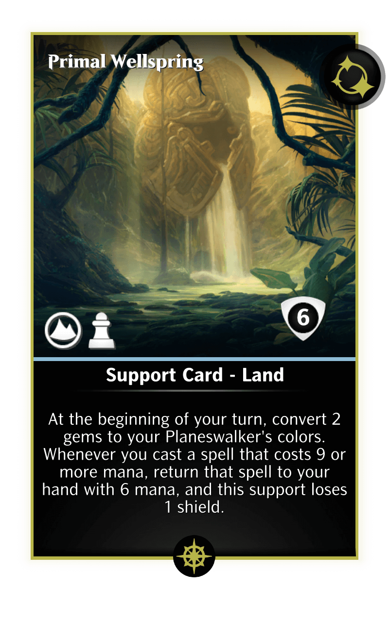 At the beginning of your turn convert 2 gems to your planeswalker colors. Whenever you cast a spell that costs 9 or more mana, return that spell to your hand with 6 mana, and this support loses 1 shield.