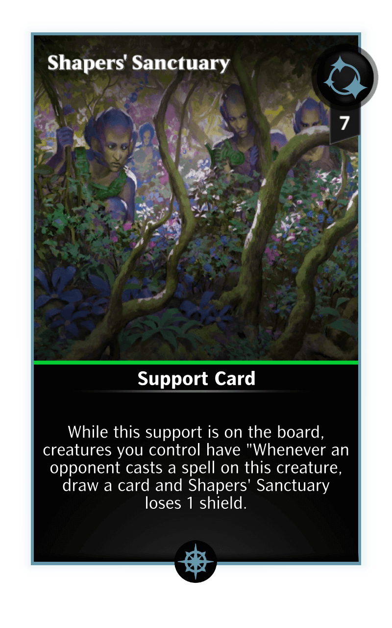 While this support is on the board, creatures you control have “Whenever an opponent casts a spell on this creature, draw a card and Shapers’ Sanctuary loses 1 shield.”