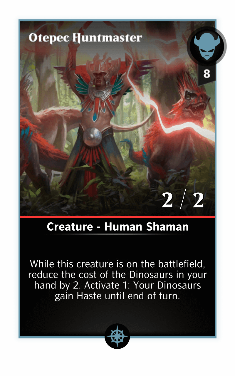 While this creature is on the battlefield, reduce the cost of the Dinosaurs in your hand by 2. Activate 1: Your Dinosaurs gain Haste until end of turn.