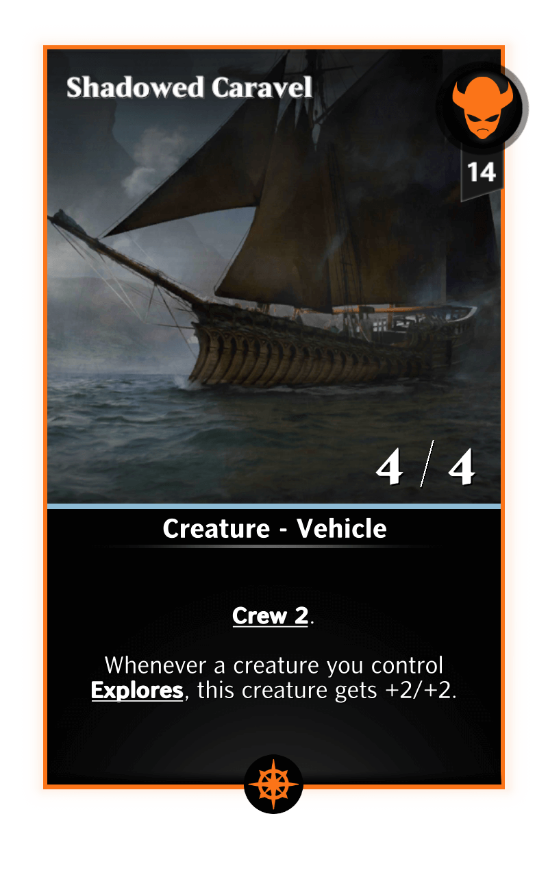 Crew 2.Whenever a creature you control Explores, this creature gets +2/+2.