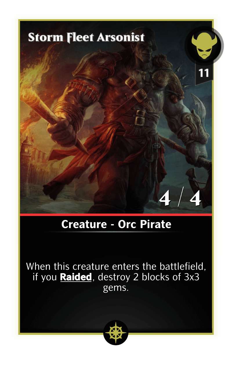 When this creature enters the battlefield, if you Raided, destroy 2 blocks of 3×3 gems.