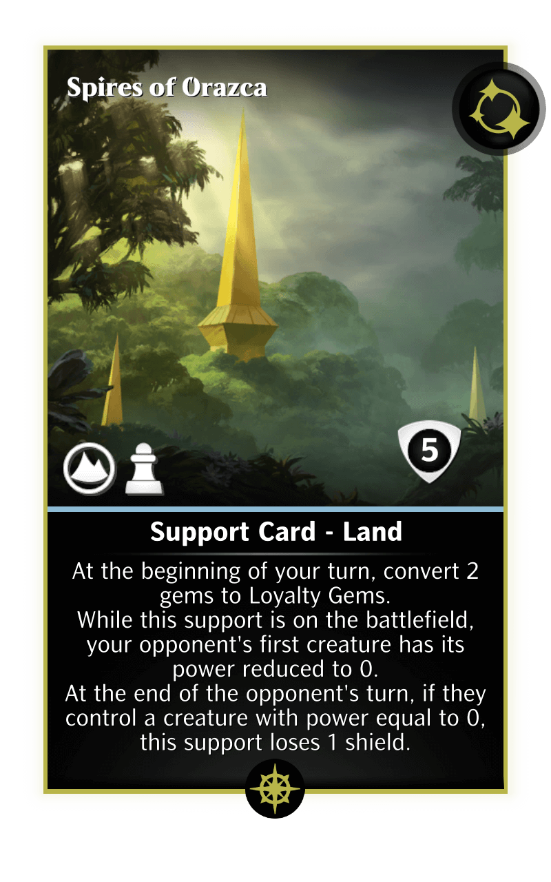 At the beginning of your turn, convert 2 gems to Loyalty Gems.While this support is on the battlefield, your opponent’s first creature has its power reduced to 0.