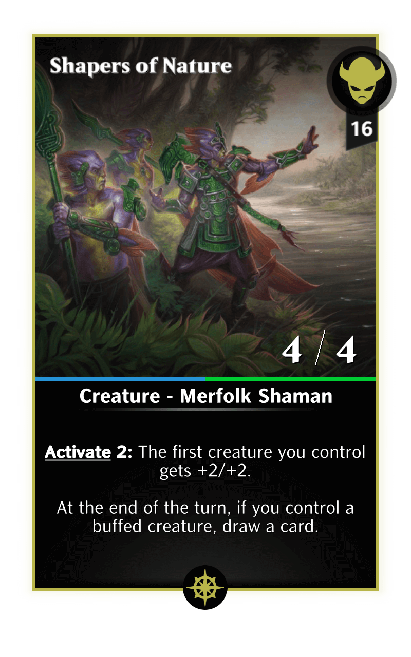 Activate 2: The first creature you control gets +2/+2.At the end of the turn, if you control a buffed creature, draw a card.