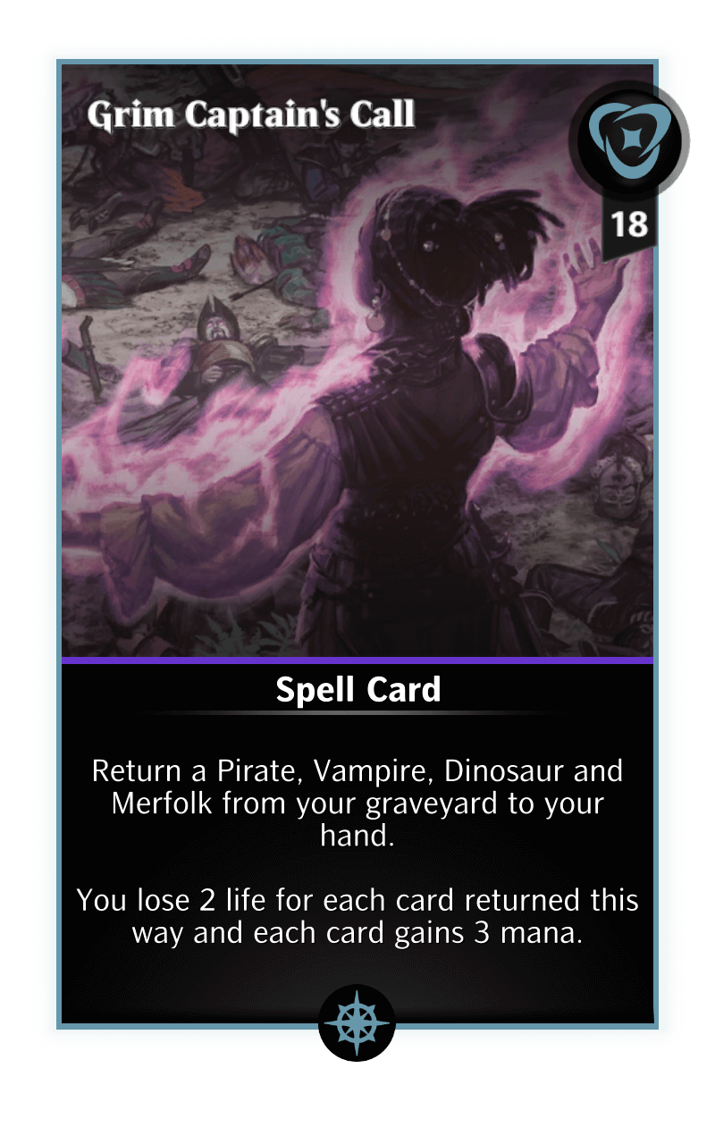 Return a Pirate, Vampire, Dinosaur and Merfolk from your graveyard to your hand.You lose 2 life for each card returned this way and each card gains 3 mana.