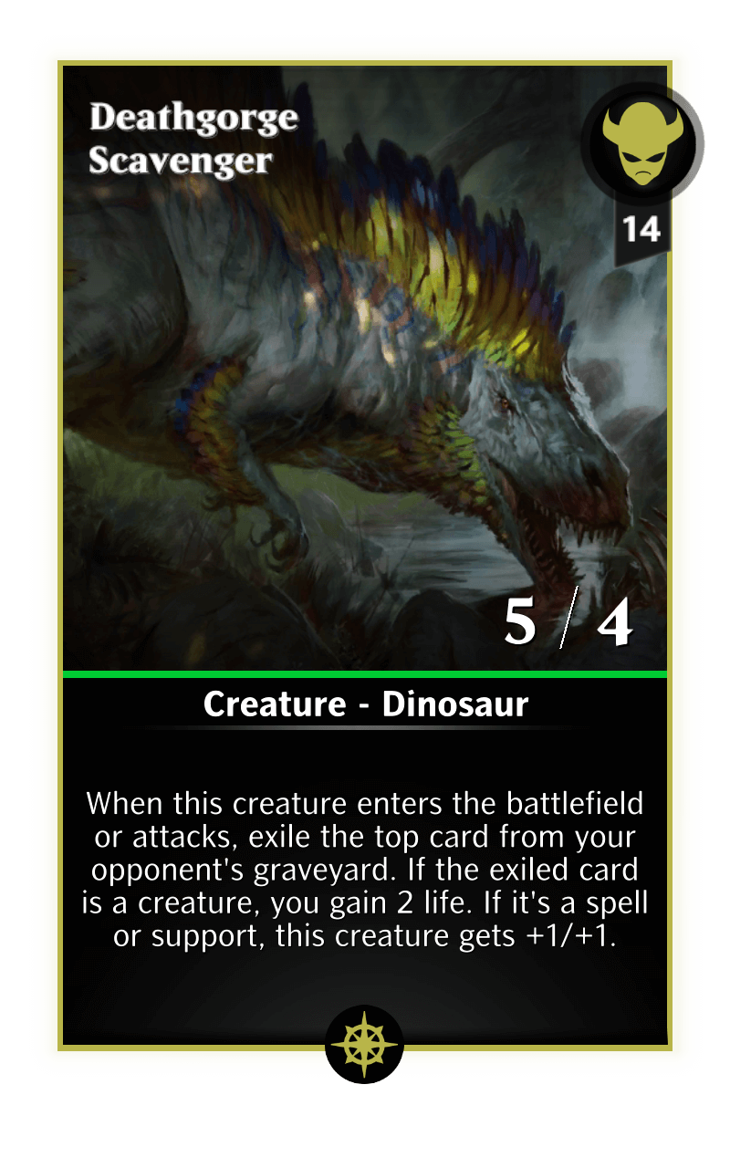 When this creature enters the battlefield or attacks, exile the top card from your opponent’s graveyard. If the exiled card is a creature, you gain 2 life. If it’s a spell or support, this creature gets +1/+1.