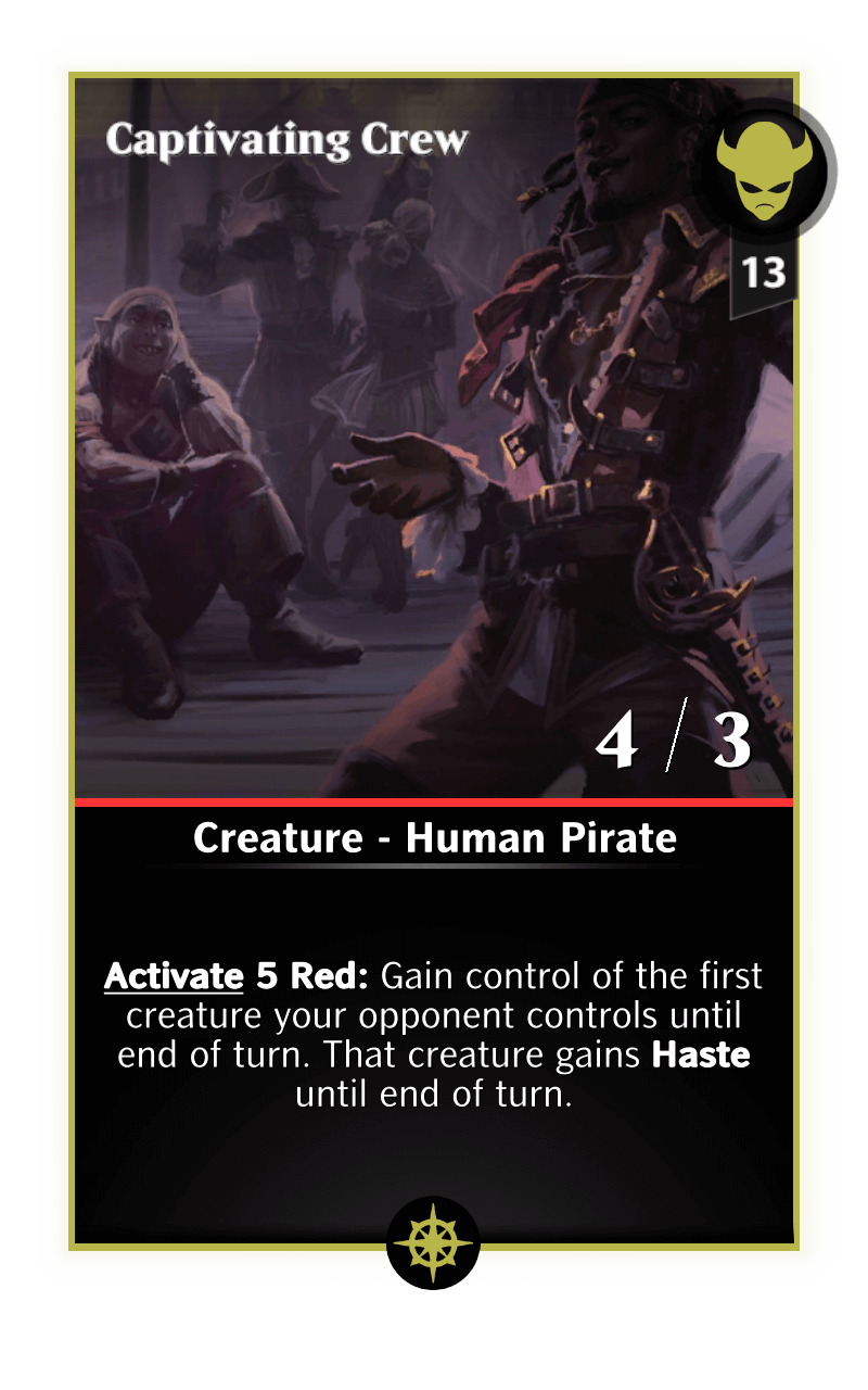 Activate 5 Red: Gain control of the first creature your opponent controls until end of turn. That creature gains Haste until end of turn.