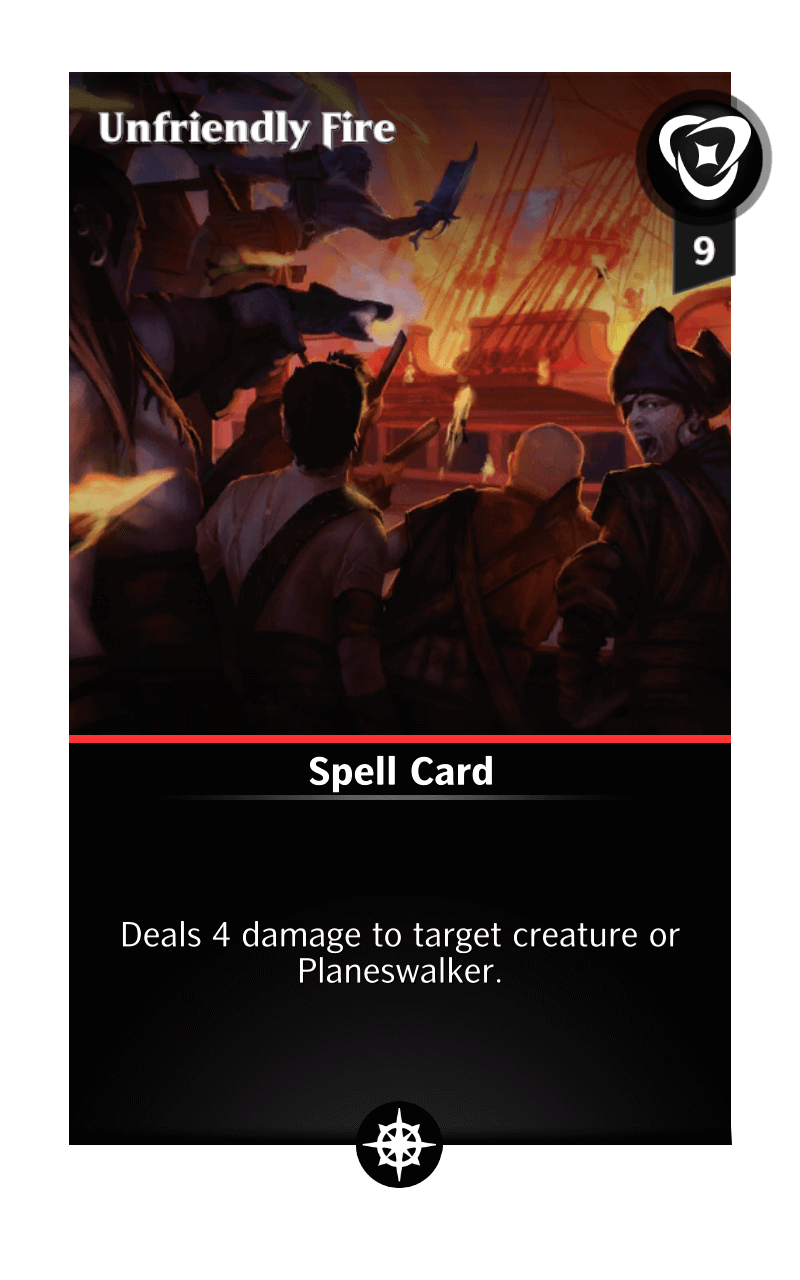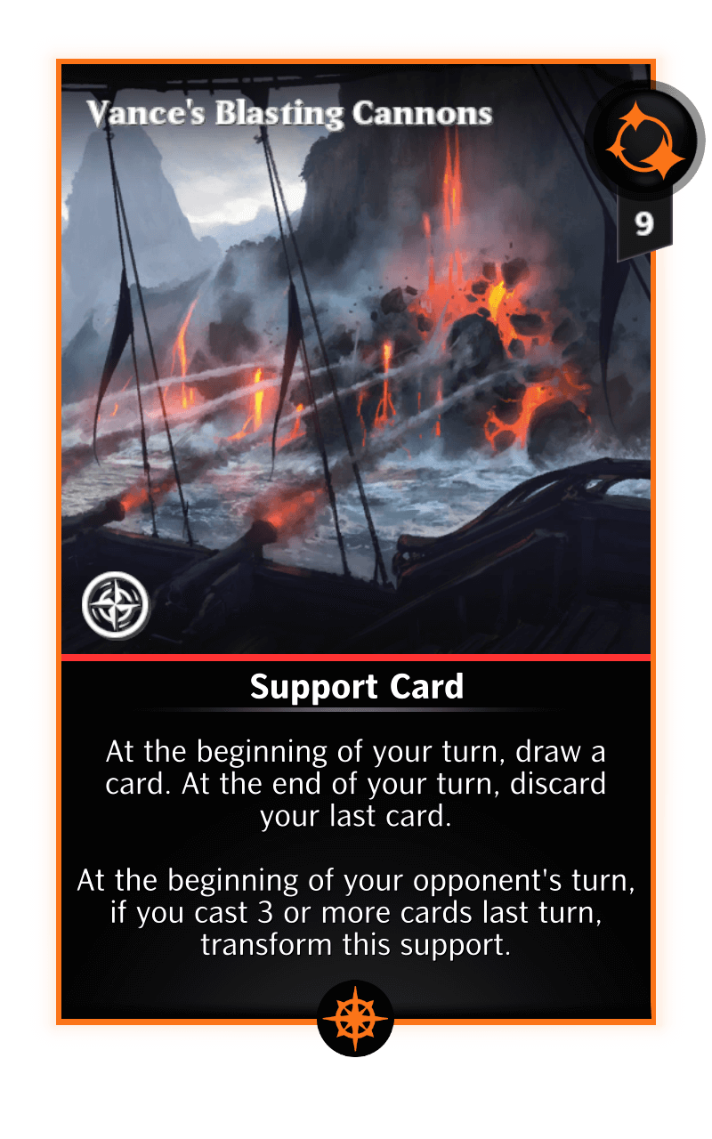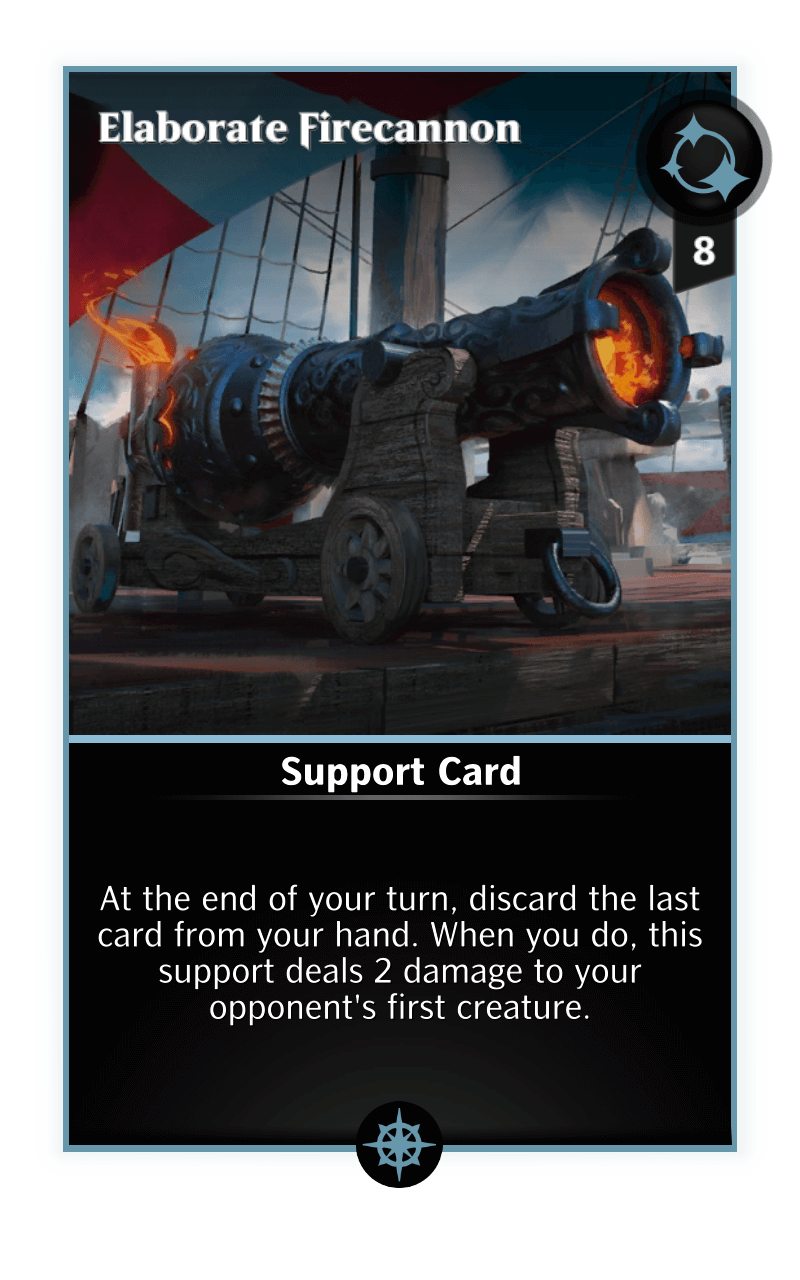 At the end of your turn, discard the last card from your hand. When you do, this support deals 2 damage to your opponent’s first creature.