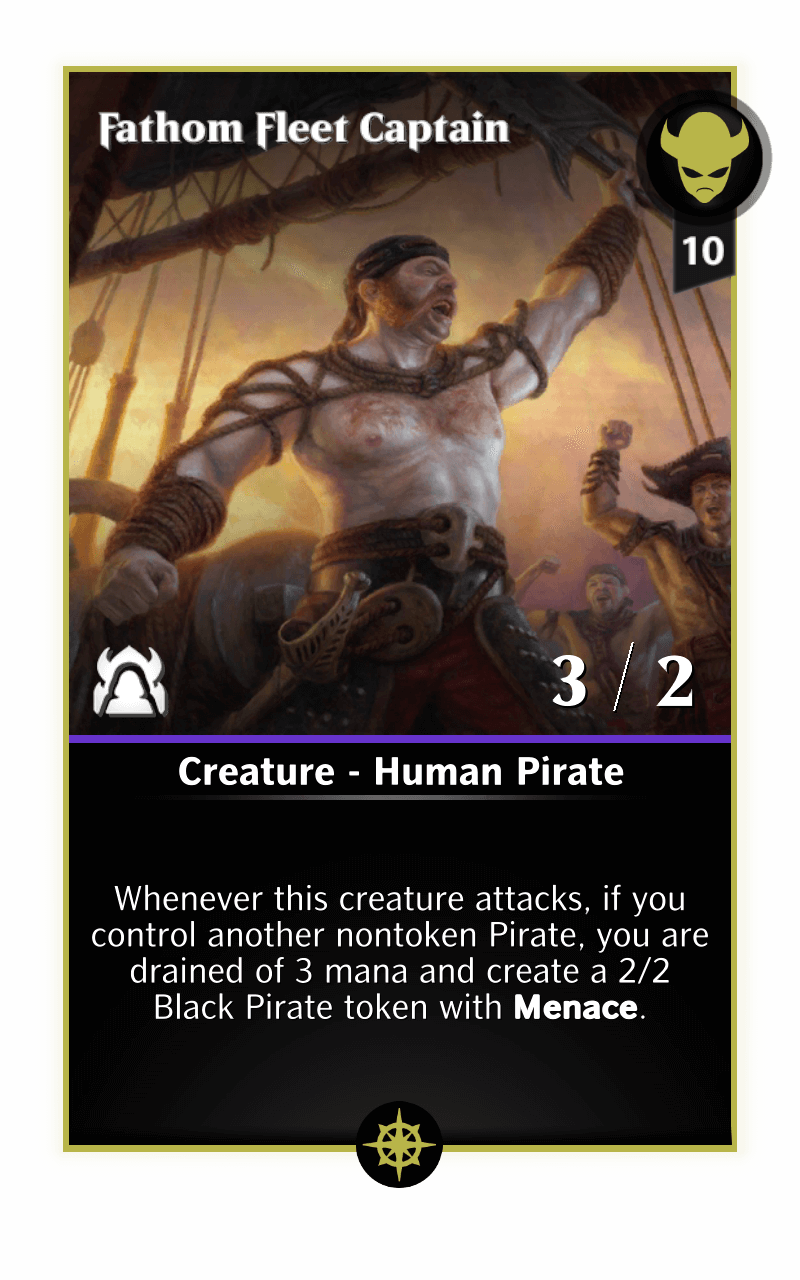 Whenever this creature attacks, if you control another nontoken Pirate, you are drained of 3 mana and create a 2/2 Black Pirate token with Menace.
