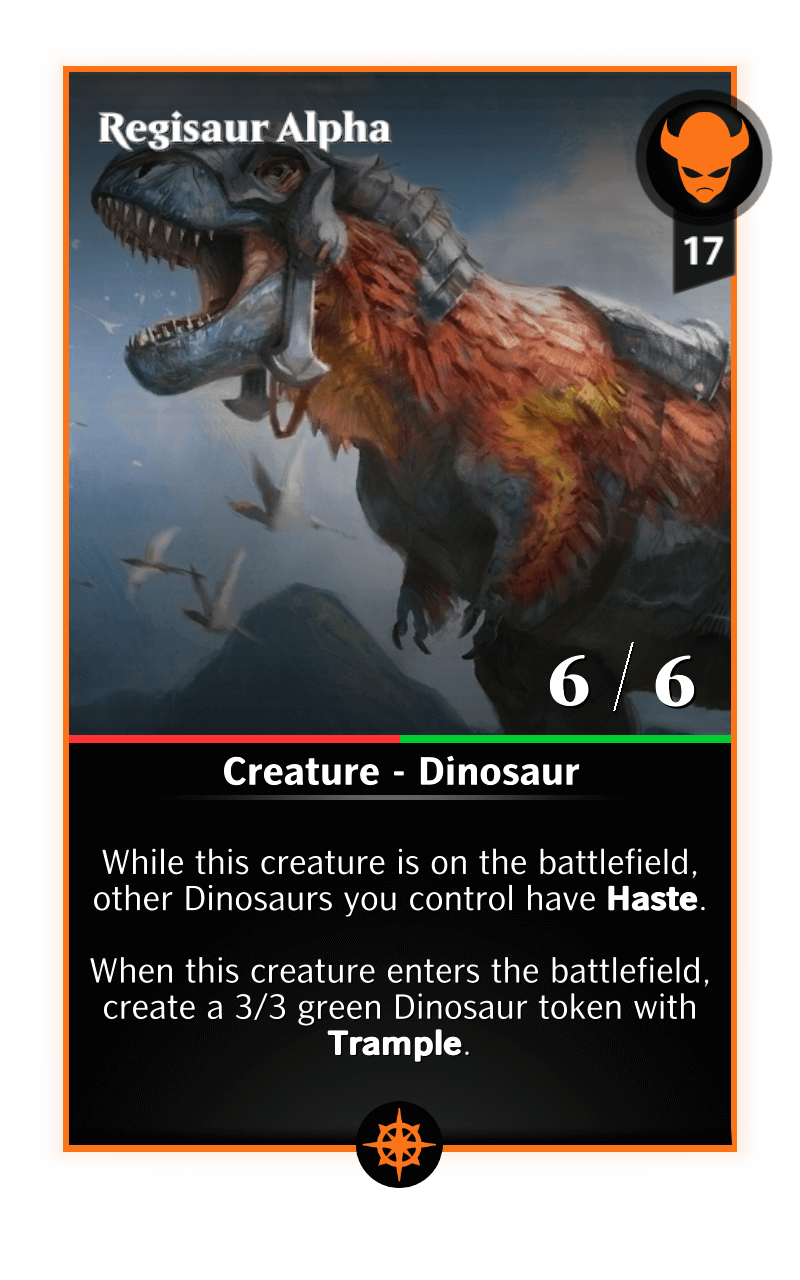 While this creature is on the battlefield, other Dinosaurs you control have Haste.When this creature enters the battlefield, create a 3/3 green Dinosaur token with Trample.