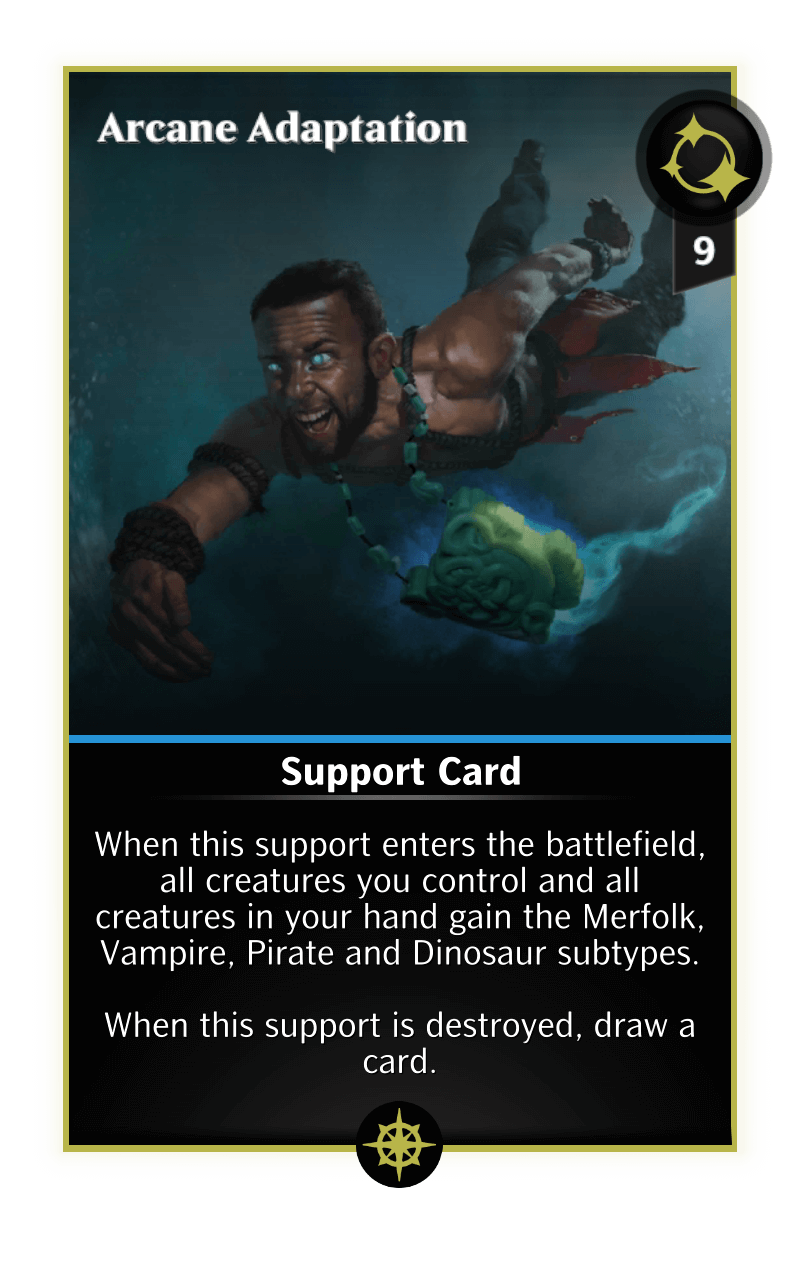 When this support enters the battlefield, all creatures you control and all creatures in your hand gain the Merfolk, Vampire, Pirate and Dinosaur subtypes.When this support is destroyed, draw a card.