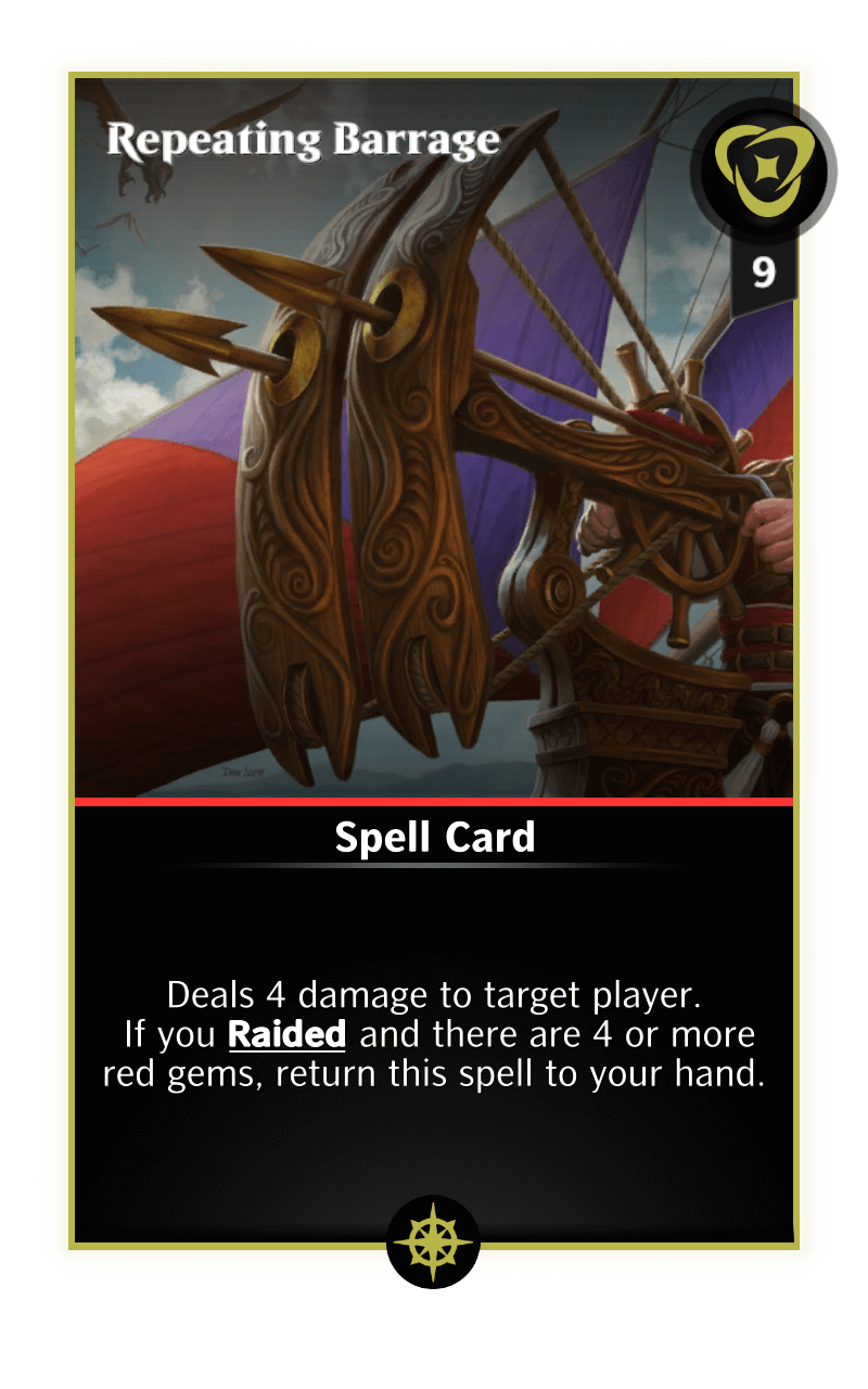 Deals 4 damage to target player. If you Raided and there are 4 or more red gems, return this spell to your hand.
