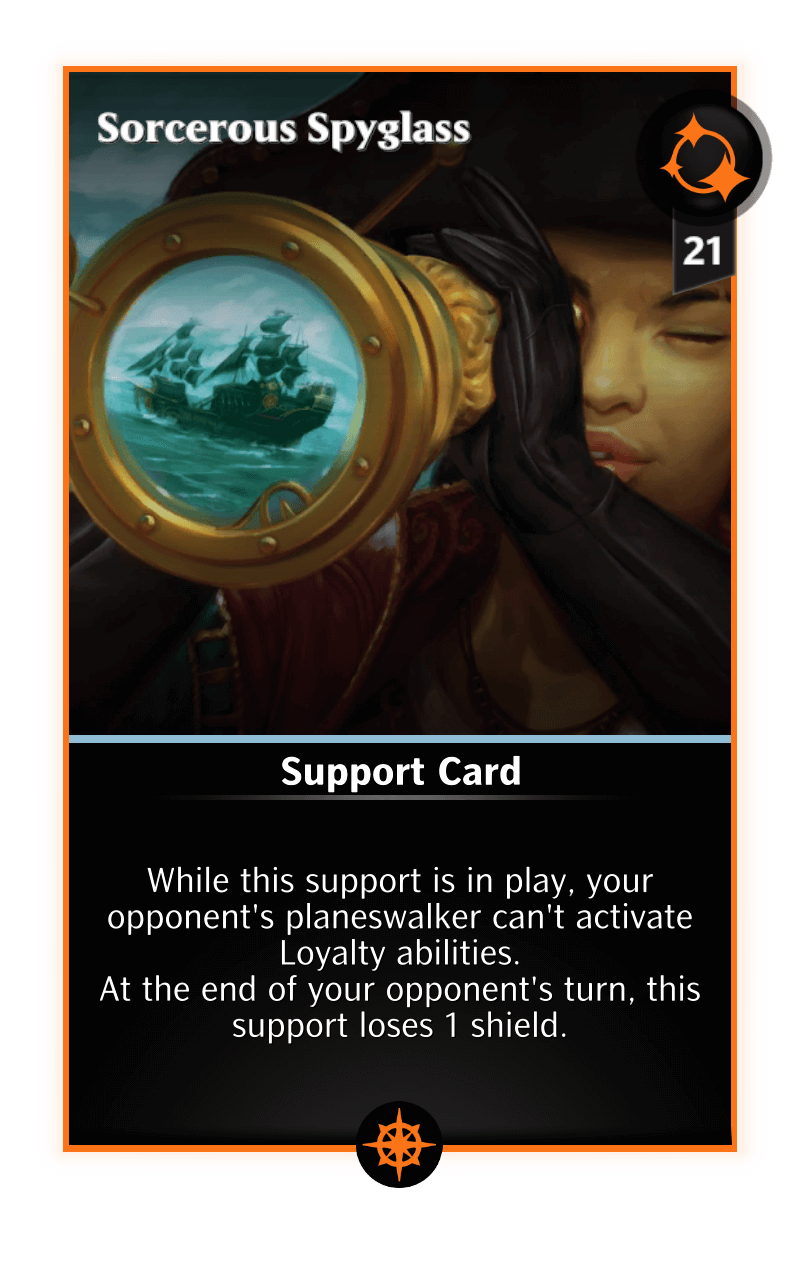 While this support is in play, your opponent’s planeswalker can’t activate Loyalty abilities.At the end of your opponent’s turn, this support loses 1 shield.