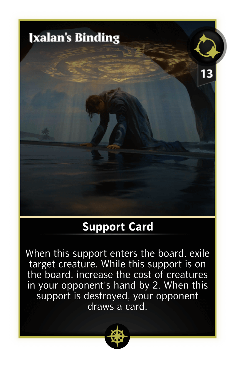When this support enters the board, exile target creature. While this support is on the board, increase the cost of creatures in your opponent’s hand by 2. When this support is destroyed, your opponent draws a card.