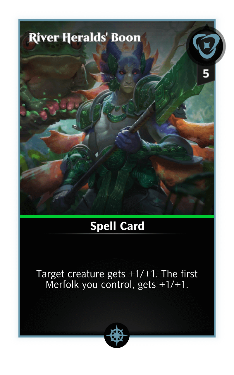Target creature gets +1/+1. The first Merfolk you control, gets +1/+1.