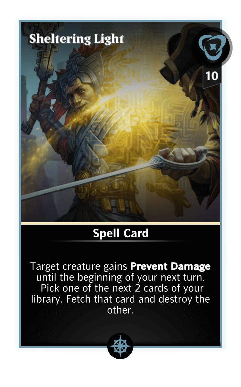 Target creature gains Prevent Damage until the beginning of your next turn. Pick one of the next 2 cards of your library. Fetch that card and destroy the other.