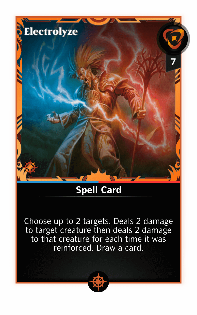 Choose up to 2 targets. Deals 2 damage to target creature then deals 2 damage to that creature for each time it was reinforced. Draw a card.