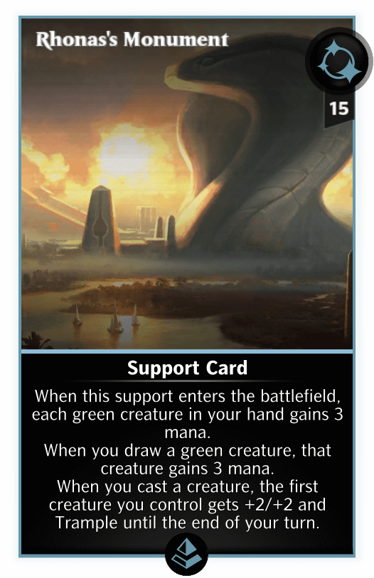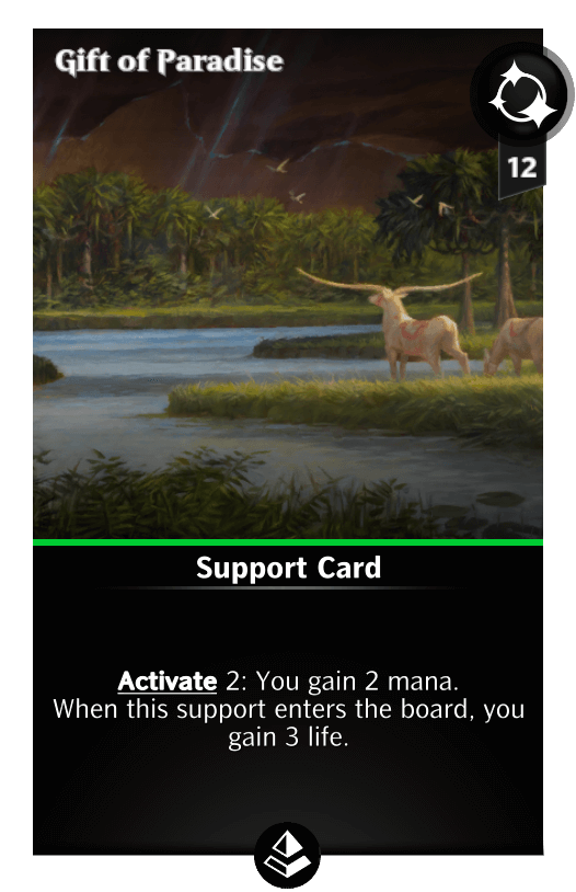 Activate 2: Draw 1 card. That card gains X mana, where X is equal to the number of shields on this support.
