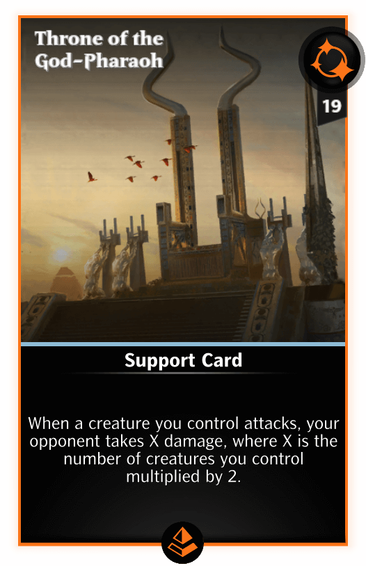 When a creature you control attacks, your opponent takes X damage, where X is the number of creatures you control multiplied by 2.