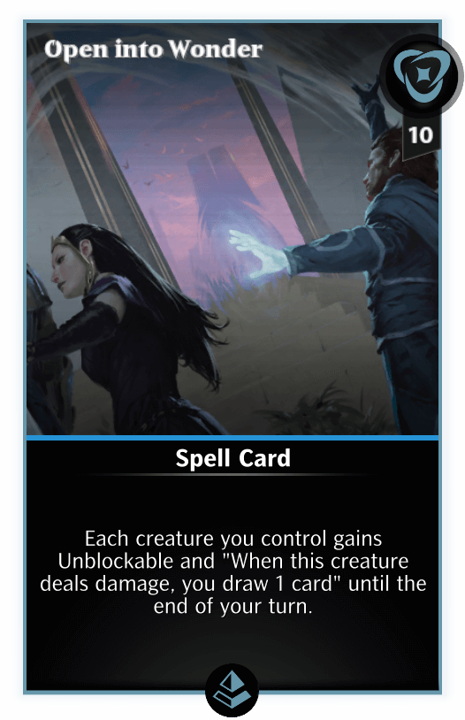 Each creature you control gains Unblockable and ‘When this creature deals damage, you draw 1 card’ until the end of your turn.