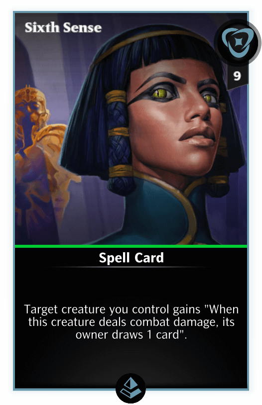Target creature you control gains ‘When this creature deals combat damage, it’s owner draws 1 card’.