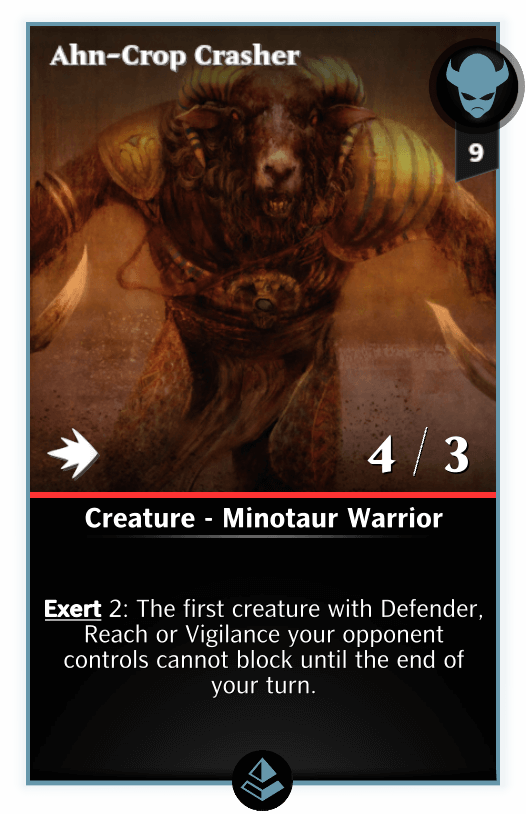 Exert 2: The first creature with Defender, Reach or Vigilance your opponent controls cannot block until the end of your turn.