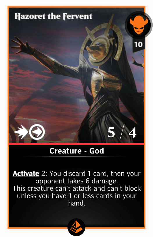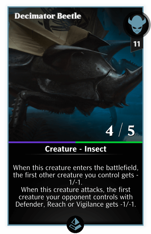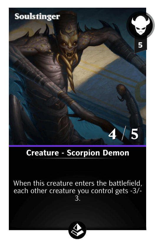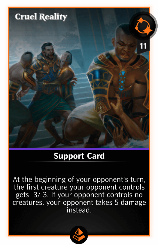 At the beginning of your opponent’s turn, the first creature your opponent controls gets -3/-3. If your opponent controls no creatures, your opponent takes 5 damage instead.