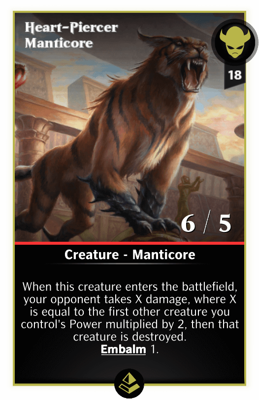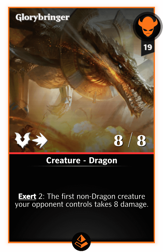 Exert 2: The first non-Dragon creature your opponent controls takes 8 damage.