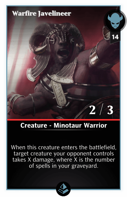 When this creature enters the battlefield, target creature your opponent controls takes X damage, where X is the number of spells in your graveyard.
