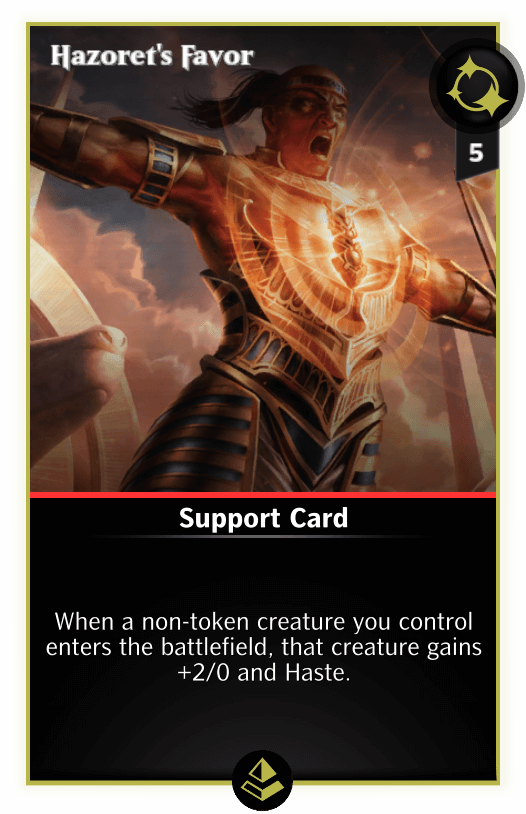 While this support is on the board, the first creature you control gets +2/+2 and Haste.